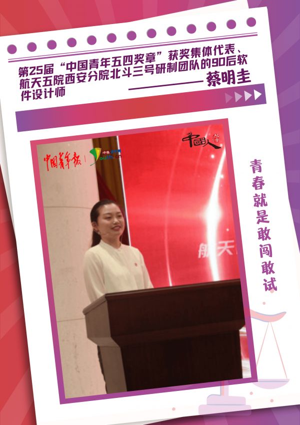 对于第25届“中国青年五四奖章”获奖集体代表蔡明圭、航天五院西安分院北斗三号研制团队的90后软件设计师蔡明圭来说,青春就是敢闯敢试。在她看来,“敢”字是核心,“快”字是关键,“干”字是保障,年轻人要刚健有为,锤炼“韧劲”“拼劲”“闯劲”。