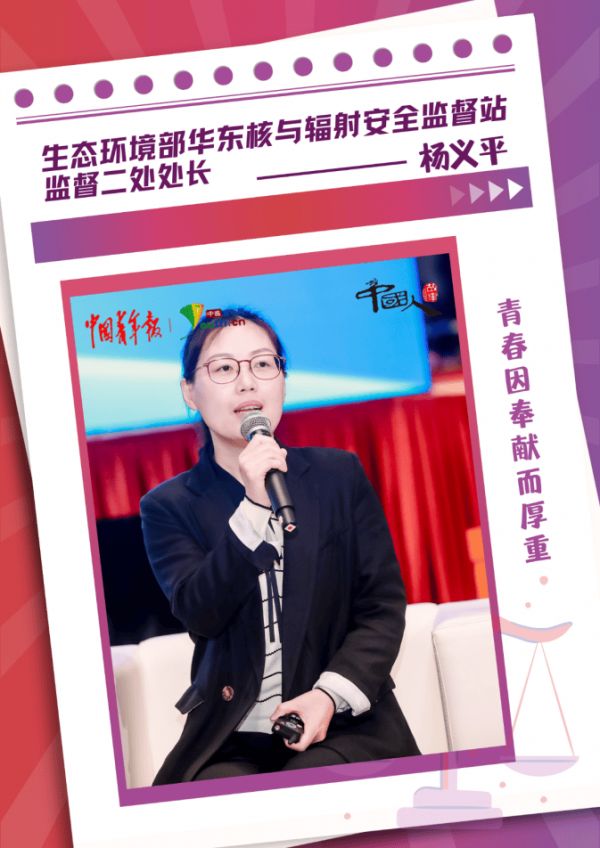 生态环境部华东核与辐射安全监督站监督二处处长杨义平来自华东核与辐射安全监督站,这里是生态环境部(国家核安全局)的6个地区监督站之一,负责华东六省一市的核安全监督工作,“大家都知道安全是核电发展的生命线,确保核安全是对国家、对人民负责的天大的事,我觉得青春因为守护核安全而变得更加厚重了些。”杨义平说。
