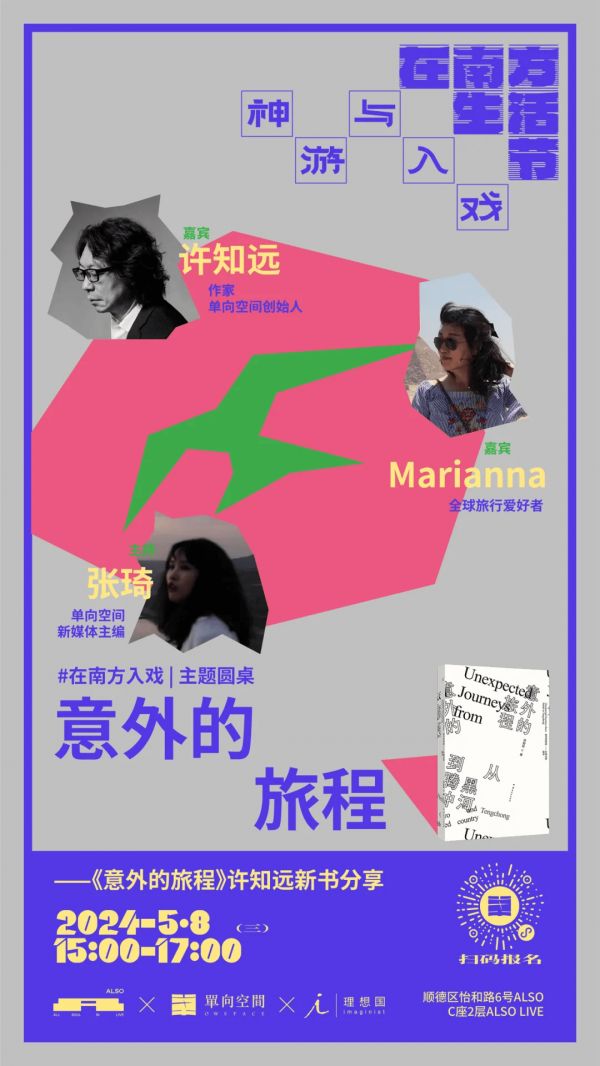 5月8日(周三),许知远再次来到南方,和全球旅行爱好者Marianna一起谈谈游记《意外的旅程》和漫游中所诞生的。步履的进度条,随时间迈动,它促使新见闻沉淀,旧记忆翻新。