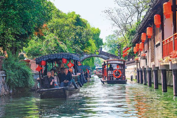 湖州市南浔古镇阳光明媚,游客乘坐摇橹船欣赏风景(2024年4月24日摄) 陆志鹏摄