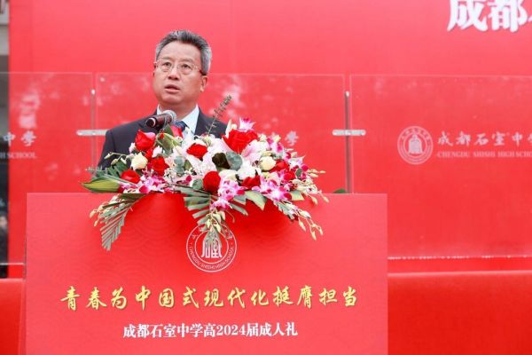 石室中学党委书记田间在仪式上也寄语孩子们,“人不是活一辈子,不是活几年几月几天,而是活那么几个瞬间。同学们,希望你们爱家、爱校、爱国,在人生的某几瞬间熠熠发光,做一个有家国情怀、有视野格局的未来领军人才,不负韶华,不负时代,不负人民,不负自己。”
