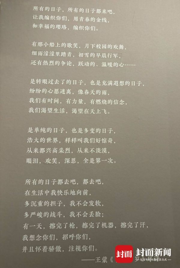 2024年1月,封面新闻记者在北京专程前往国博参观“青春作赋思无涯——王蒙文学创作70周年展”。整个展览分为“青春万岁”“这边风景”“创作是一种燃烧”“大块文章”“文化的光照”5个部分,以近300张照片和550余件展品,全景记录王蒙70年来的文学人生。泛黄的稿纸上,跃动着青春的华章;老旧的照片里,映照出多彩的生活……