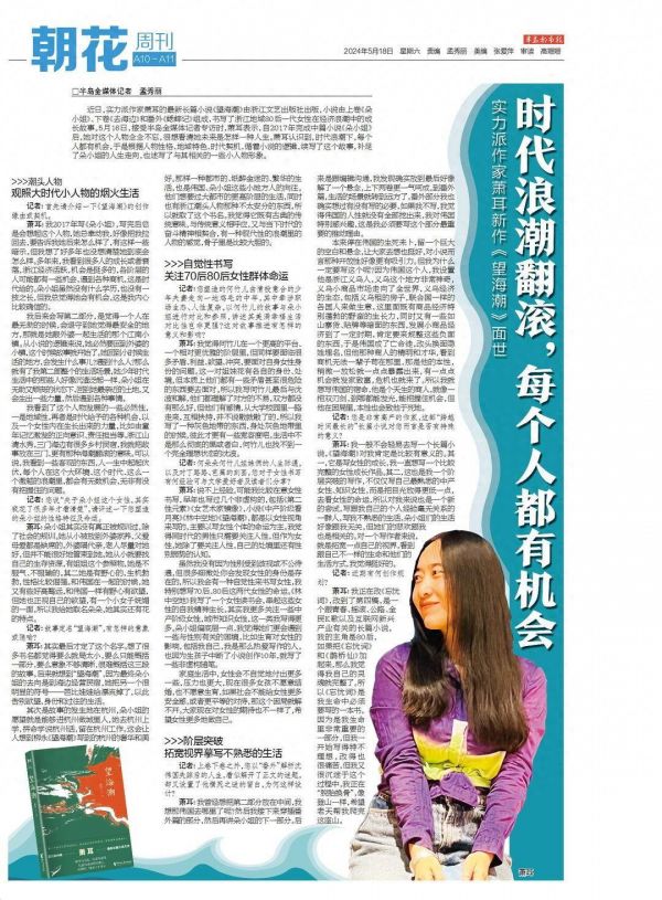 近日,实力派作家萧耳的最新长篇小说《望海潮》由浙江文艺出版社出版,小说由上卷《朵小姐》、下卷《去海边》和番外《蟋蟀记》组成,书写了浙江地域80后一代女性在经济浪潮中的成长故事。5月16日,接受半岛全媒体记者专访时,萧耳表示,自2017年完成中篇小说《朵小姐》后,她对这个人物念念不忘,很想看清她未来是怎样一种人生。萧耳认识到,时代浪潮下,每个人都有机会,于是根据人物性格、地域特色、时代契机,循着小说的逻辑,续写了这个故事,补足了朵小姐的人生走向,也述写了与其相关的一些小人物形象。