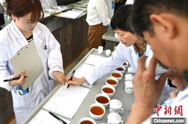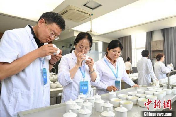 专家评审通过外形、汤色、香气、滋味、叶底五大评审要素,对徽茶进行评比。韩苏原 摄