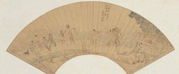 因水源而起争执,是农业生产中的常事,攘臂大呼,跺足插手,从气势上压倒对方,才能理直气壮地占用水资源。明代张宏所绘的《农田水车图》扇则惟妙惟肖地捕捉到了这一发生在田间的争吵。