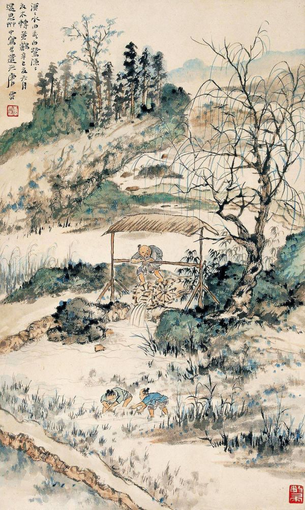 近代海派画家唐云的画作中也有车水图,为其32岁时所作,款字题道:“漠漠水田飞白鹭,阴阴夏木啭黄鹂。”这是唐代诗人王维《积雨辋川庄作》诗中的句子。