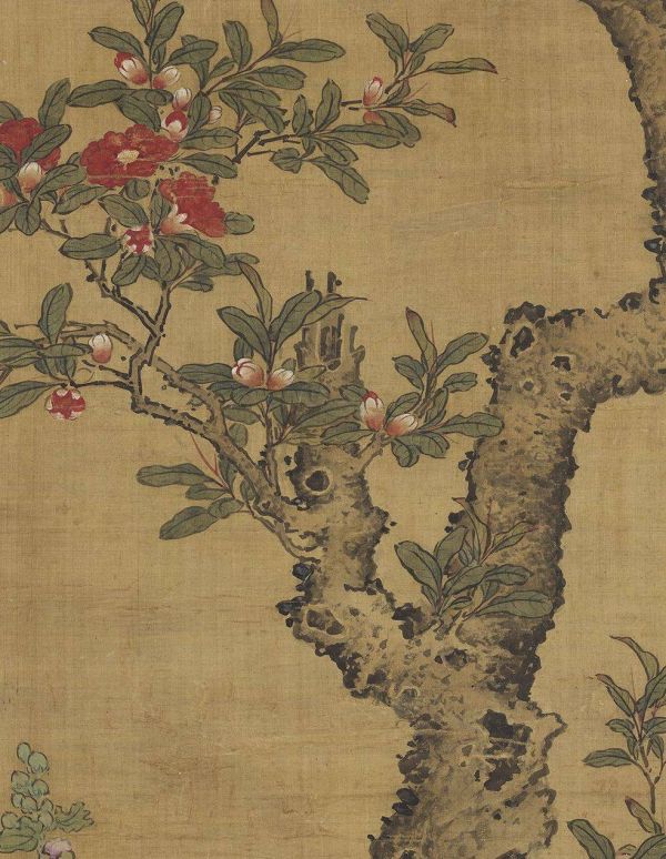 元人 《画天中华瑞》,画石榴树下,蜀葵盛开,栀子花也争相斗艳,还有蒲艾、野菊点缀于树石下。树皮以点状皴纹表现,有着苍老斑驳的感觉。