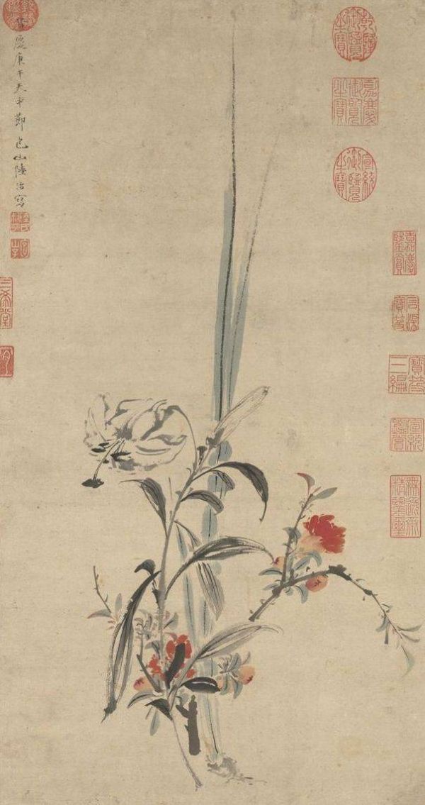 历代书画亦不乏榴花佳作,其中有的以折枝花卉曲尽其妙,有的作为端午小景的时节花卉出现。如元人的《画天中华瑞》轴,明代陆治的折枝榴花则有文徵明草书跋:江南五月绿枝匀,剪剪轻罗蹙绛巾。珍重东君怜寂寞,故将秾艳表余春。