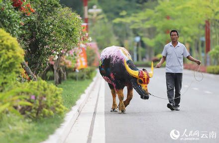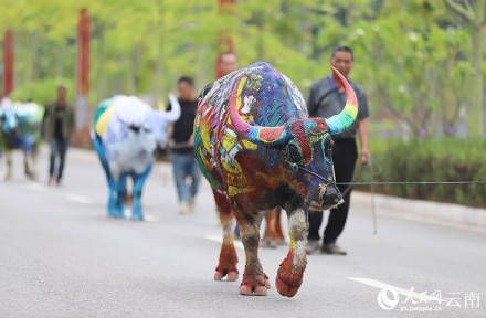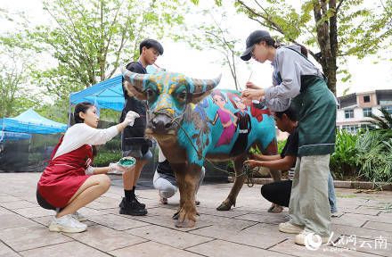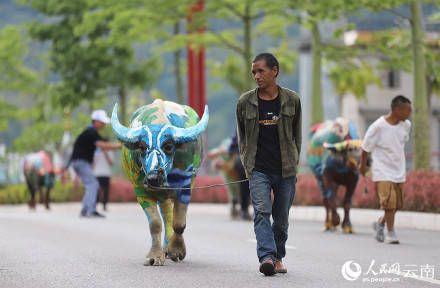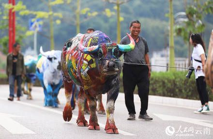 近日,云南普洱,江城哈尼族彝族自治县举行第六届牛体彩绘大赛,46头水牛被绘上了形象生动、五彩斑斓的图案。江城牛体彩绘历史悠久,最初是为了防止猛兽捕食耕牛,发展到今天,已经演变成了一项艺术活动,画师用五彩画笔把美丽故事和美好愿景描绘在牛身上。(人民网云南频道)