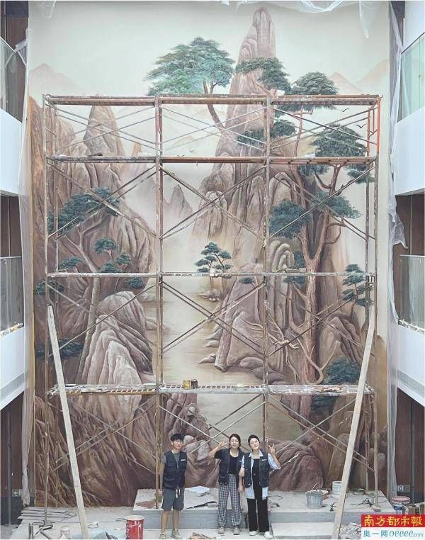 一条条的短视频中,他们拿着铲刀、画笔爬上十几米高的脚手架,用笔在屋檐下勾出立体壁画的大致轮廓,再用铲刀将图案的轮廓“刮”出来。“铲墙、打磨、调色、刷漆……起稿打钉子是最困难的,这是整幅壁画的基础。”浮雕壁画工艺特殊,要求极高,画图、定位、绕线、上色每一步都需要精确无误。梁铭杰说:“比如那条被外交部点赞的作品,整幅壁画作品近40平方米,我们花了7天时间才完成。”