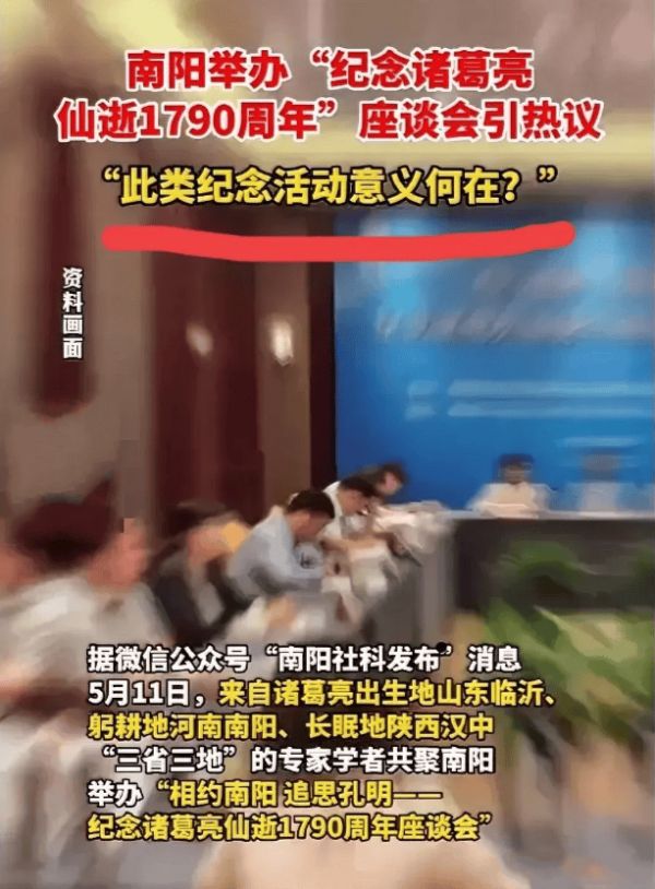 河南南阳这座老城,最近因为纪念诸葛亮的座谈会又火了一把!邀请了那么多专家学者,大家围坐一起,讨论诸葛亮的生平、地位和影响。座谈会上,专家们对诸葛亮可是赞不绝口,说他智慧过人、胆识出众,人格魅力也是一流。诸葛孔明在梦中恐怕也未曾料及,他离世后的千余载,竟有人专程为他举办座谈会!至于座谈会上究竟探讨了些什么,我亦是一头雾水,无从知晓“纪念诸葛亮仙逝1790周年”,美其名曰“相约南阳,追忆孔明”。这场派对,那可是三省精英(临沂、南阳、汉中)的“最强大脑”集结号,就差孔明本尊穿越现身签名了!六 总结:“经费来自民间社会团体”,“肯定是有意义”