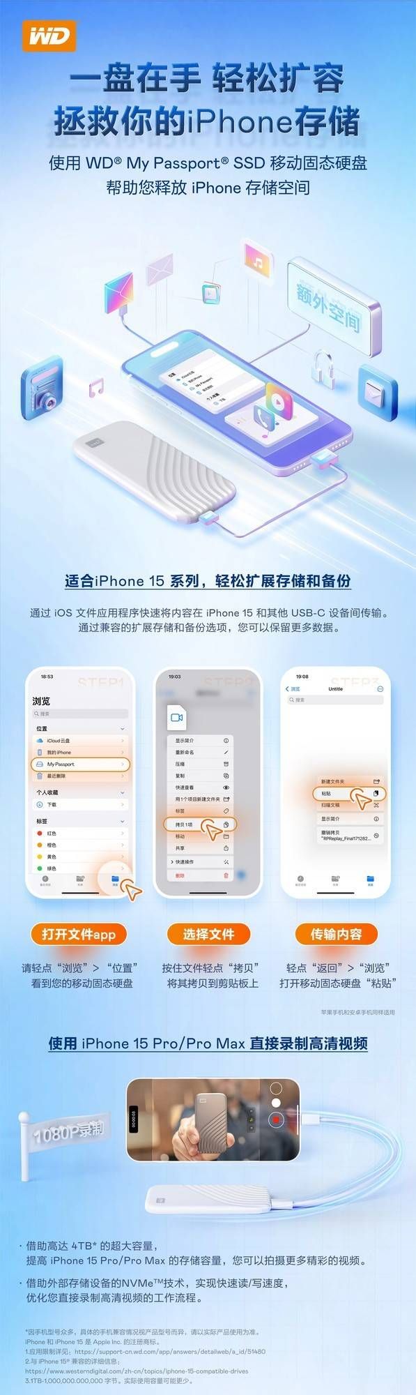 除了外观上的惊喜,软件服务上也大有突破。西数My Passport随行SSD版移动固态硬盘兼容多种设备使用场景,除了常见的搭配电脑使用之外,还可以连接手机,特别是iPhone 15系列。一方面,利用兼容的USB-C 接口,将iPhone15系列打造成强大的内容存储工具,实现扩展手机存储空间和重要数据备份。另一方面,配合iPhone 15 Pro/Pro Max系列还可以支持高清视频直录功能。把西数My Passport随行SSD版移动固态硬盘连接到iPhone 15 Pro/Pro Max之后即可快速识别,此时,我们就可以录制高清视频并保存在移动固态硬盘中。借助高达 4TB* 的大容量,扩展iPhone 15 Pro/Pro Max的存储空间,可以拍摄更多精彩的视频。同时,借助外部存储设备的NVMe技术,实现快速读/写,优化直接录制高清视频的工作流程。西数My Passport随行SSD版移动固态硬盘,让 iPhone 15不仅是一部智能手机,也是一个具有无限可能性的中心。