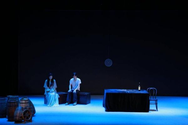 《安娜·克里斯蒂》采用了小剧场的演出形式,为了拉近戏剧与观众的距离,在舞台空间的处理上非常特别,把演员和观众一起带向奥尼尔“浓雾弥漫的海”,在观众席前摆放栏杆道具,使其成为停靠在海边货船甲板上的一角,魔术般地将观众和大海连成了一片,让观众和演员思考捉摸不定的命运……剧终演员再次出场谢幕,观众才意识到故事已经结束,现场掌声经久不息。