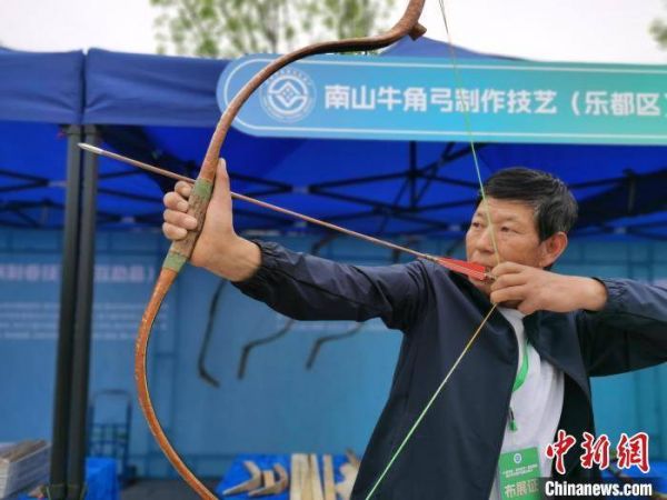 图为牛角弓制作技艺传承人拉弓射箭。张添福 摄