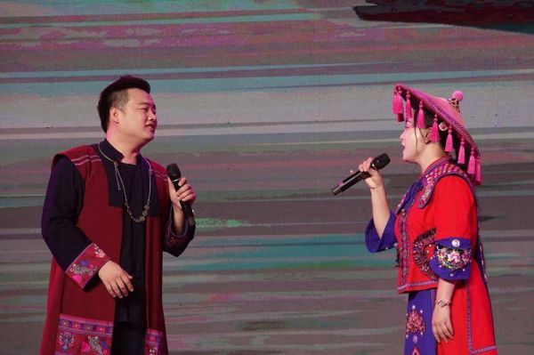 河池市非物质遗产文化遗产保护中心的演员表演小组唱《人人叫我山歌妹》。