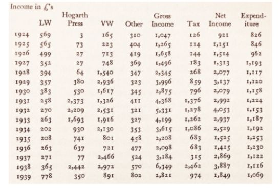 伦纳德能任性地炒老板鱿鱼,底气主要来自经济收入的改善:霍加斯书局事业蒸蒸日上。从他不厌其烦罗列的数字里,我们可以看到从1924年到1929年,霍加斯书局和弗吉尼亚·伍尔夫的收入呈逐年递增的趋势,后面虽有起伏,却多年保持着良好水平。