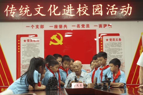 5月29日,在“六一”儿童节即将到来之际,湖南省邵阳市洞口县龙山社区联合洞口县思源学校,组织开展“传统文化进校园”主题党日活动。87岁高龄的省级非遗墨晶石雕传承人、党员唐文泰带着作品来到该校,为学生讲述洞口墨晶石雕的辉煌发展历程,并现场演示墨晶石雕制作工艺,让孩子们现场感受中华传统文化的博大精深。
