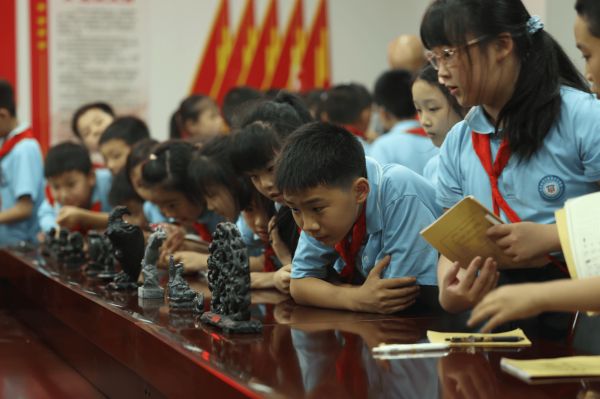 孩子们正在欣赏墨晶石雕(刘金汉 摄)