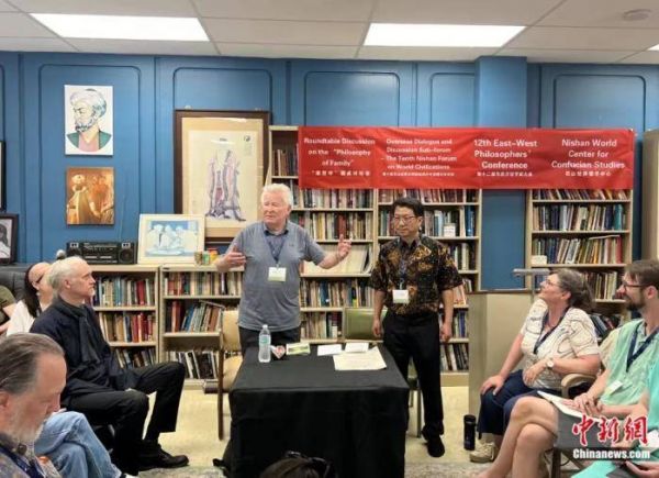 2024年5月,第12届东西方哲学家大会在美国夏威夷州首府檀香山举行“家哲学”圆桌会。北京大学哲学系人文讲席教授安乐哲(Roger T. Ames)和尼山世界儒学中心副主任、中国人民大学哲学院教授温海明(中间偏右站立者)同与会者交流。 张朔 摄