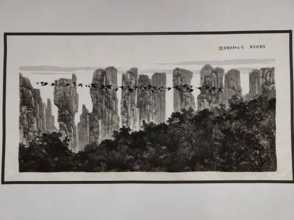 “中国的山水画并不是单纯的艺术表达,其中透射着中国传统儒家文化的社会秩序,是一种文化的象征。”蔡林园在谈及其艺术创作时如是说。在蔡林园先生的指导下,学员秦女士完成了一幅别具匠心的山水画。这幅画的创作灵感源自秦女士在张家界的旅行感悟,她的初稿过于写实,缺少文化的融入。蔡先生亲自指导她在画中加入树木、祥云和剪影候鸟等元素,使画作不仅体现了自然景色的美丽,更蕴含了中国山水画中祥和、生命的文化意象。