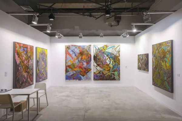 沿动线往里走,走到 JINGART A11 号伯年艺术空间展位,你会为这些丰富、活泼的色块停下脚步。这里正在呈现的是艺术家葛雅静的个展,丰盛的色彩和媒介在她的画布上黏合,亲密,和谐,却富有张力。