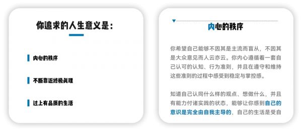 既然这是一个很重要、绕不开的人生议题,但独自思考又容易怀疑人生。不如借助一些工具帮我们找到答案,KY测评自主研发的【人生意义梳理测评】就是这样的工具,我们通过访谈、文献搜集总结了13种具有代表性的人生意义,再通过迫选题的形式,在一道道题目中进行对比分析(很多时候我们只有通过对比才知道自己真正舍弃了什么,重要的那个才会凸显出来),帮你觉察到人生意义的答案。