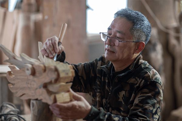 朱田玉在雕刻“龙头”(周社根 摄)