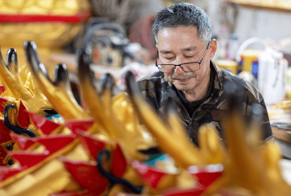 端午将至,全国各地龙舟赛、非遗展演活动多,各式龙舟“龙头”需求量大,连日来,江苏省兴化市兴东镇高垛村的民间艺人朱田玉正加班加点制作“龙头”供应市场。