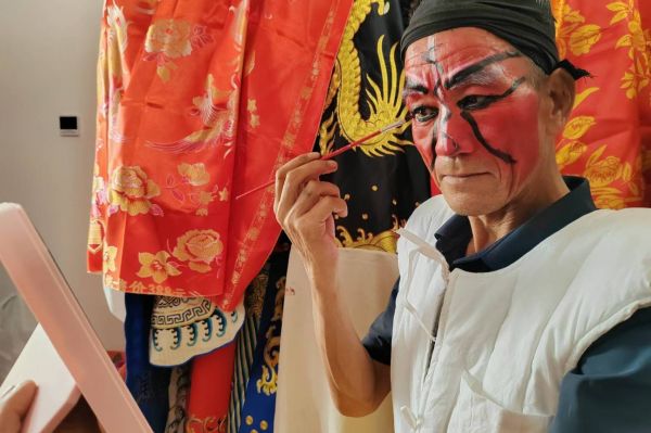 在后台,仇银粮对着镜子,往自己的脸上勾画脸谱。过会儿,他要带妆表演秦腔传统选段《下河东·赶驾》。