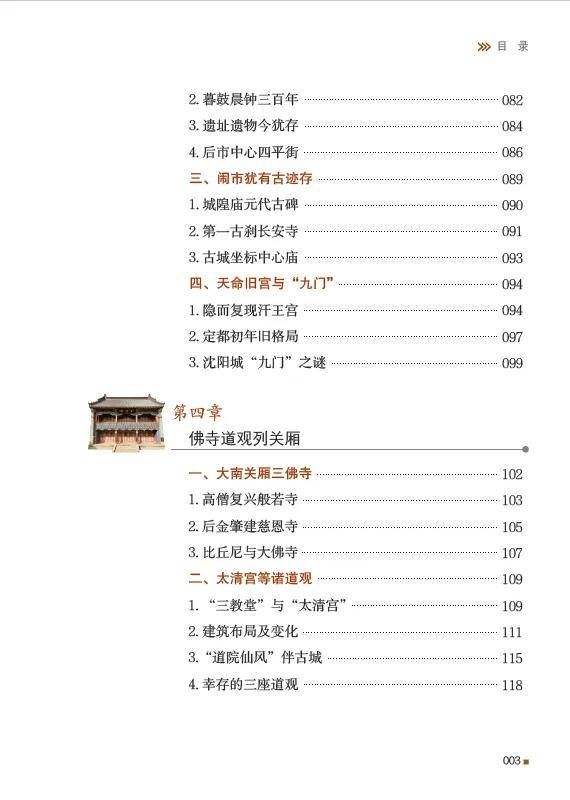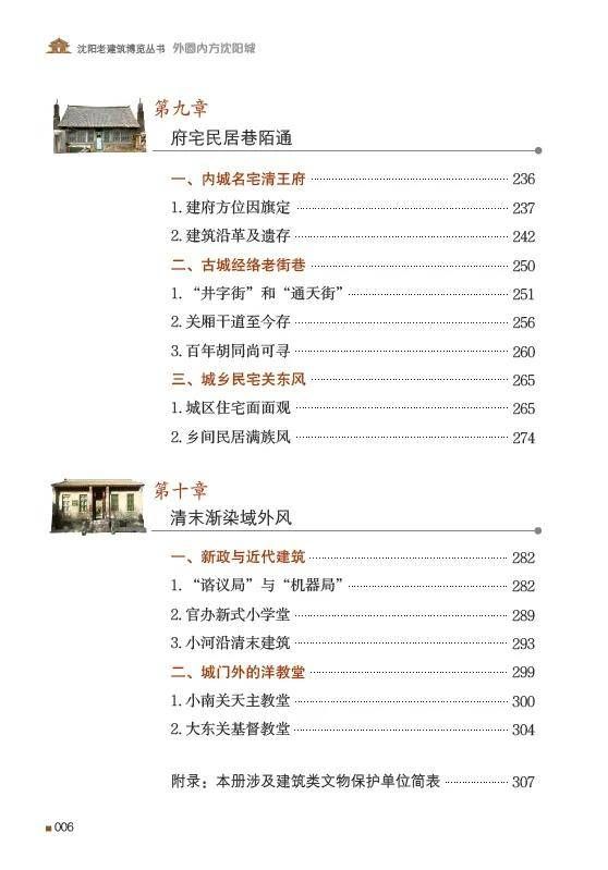 本书系沈阳老建筑博览丛书之一,系沈阳市哲学社会科学课题成果。以文物建筑为引,透过一幅幅珍贵的图片,讲述沈阳城前世今生。沈阳有2300多年的建城史,现存历代古迹遗址颇多。公元1625年,后金汗王努尔哈赤定都沈阳,开启了这座千年古城的新纪元。本书收录的文物建筑,大多形成于清代,涵盖被列入世界遗产的“一宫两陵”,身处闹市的八门八关、鼓楼市井,散处郊野的前代梵刹古塔、御路名桥,以及明清城垣故址、古老街巷、传统民居等。既有对古建筑风貌的描绘,又有对其见证历史的讲述。本书将带你沿着历史的脚步在沈阳漫步,领略独具特色的古城氛围。