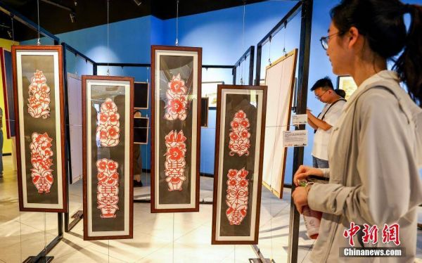 6月7日,观众参观在湖北武汉凯德西城举办的《武汉·纸墨印象》中法跨国双人艺术展。此次展览由中国艺术家涂颖慧与法国艺术家皮埃尔·康努乐联袂共创,他们将水墨和剪纸这两种中国传统的艺术形式结合,并在创作中融入他们当下对艺术的理解,从全新的视角诠释对武汉这座城市的印象,展现中法艺术共融互通。图为观众参观中国艺术家涂颖慧剪纸作品《四季双喜》。张畅 摄