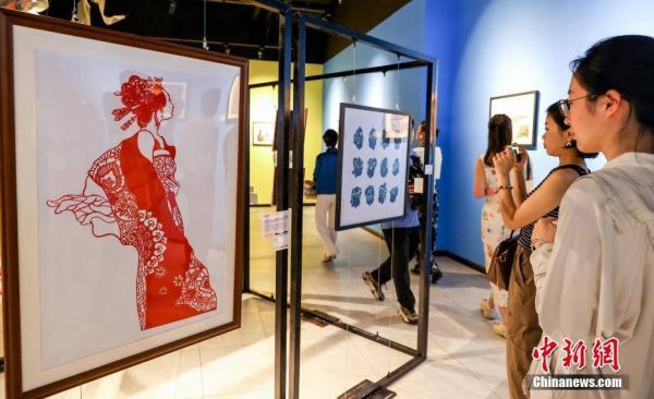 6月7日,观众参观在湖北武汉凯德西城举办的《武汉·纸墨印象》中法跨国双人艺术展。此次展览由中国艺术家涂颖慧与法国艺术家皮埃尔·康努乐联袂共创,他们将水墨和剪纸这两种中国传统的艺术形式结合,并在创作中融入他们当下对艺术的理解,从全新的视角诠释对武汉这座城市的印象,展现中法艺术共融互通。图为观众参观中国艺术家涂颖慧剪纸作品《侍女图》。张畅 摄