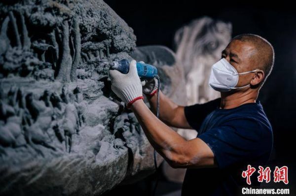 6月4日,惠安石雕传承人刘国文在雕刻作品《大地之歌》。 李南轩 摄