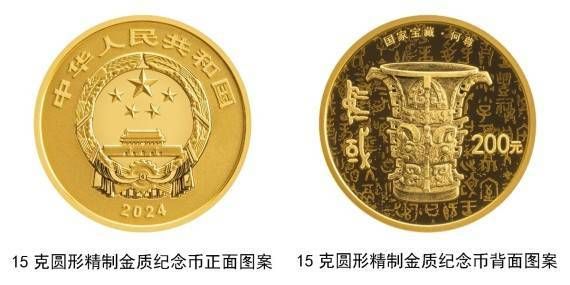 15克圆形金质纪念币背面图案为何尊造型,衬以何尊局部铭文并凸显铭文“中国”字样,并刊“国家宝藏·何尊”字样及面额。