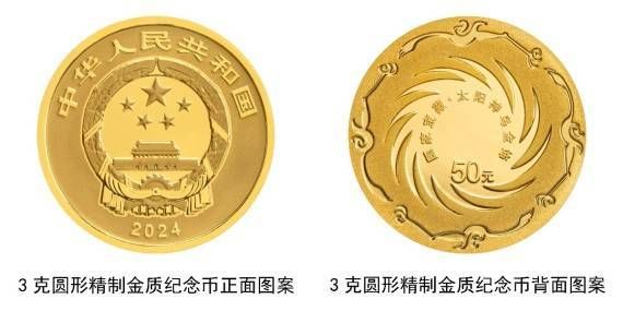 3克圆形金质纪念币背面图案为太阳神鸟金饰造型,并刊“国家宝藏·太阳神鸟金饰”字样及面额。