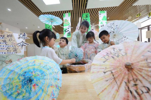 6月7日,在江西省抚州市东乡区第十二幼儿园,师生通过做漆伞、赛龙舟、挂艾草等习俗,传承中华传统文化,感受端午节丰富的文化内涵,共度端午佳节。(饶方其)
