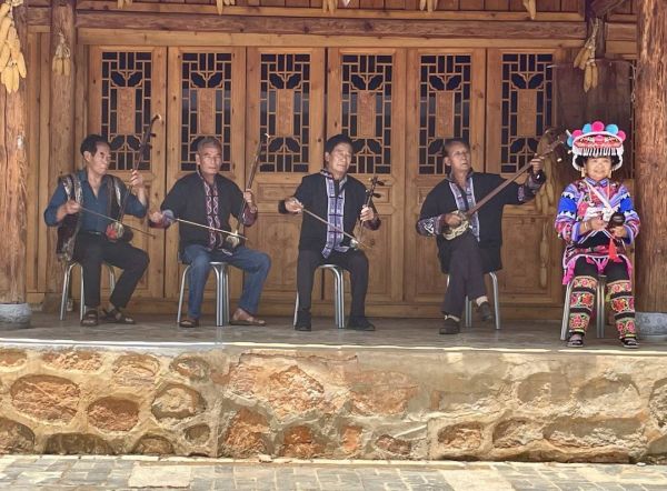 情景演出中,有一段5人合作的谈经古乐弹奏表演。迤沙拉的谈经古乐,由洞经音乐发展而来,距今已有600多年的历史。其乐器包括二胡、京胡、三弦、芒锣、唢呐、竹笛等,曲调古朴清新,既有宫廷音乐的悠扬婉转,也含江南水乡的小调韵味,多人演奏为最佳。