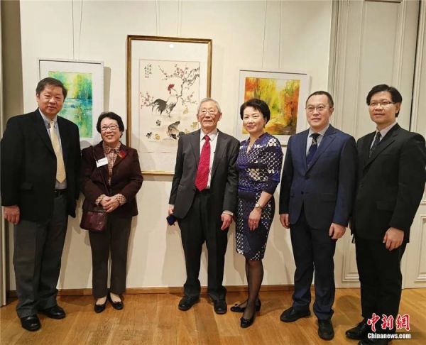 2024年3月,阮丽明(左二)携画作参加布鲁塞尔“艺术·彩色的纽带——中欧女艺术家作品展”,与丈夫魏崇明(左三)及观展嘉宾合影留念。受访者供图