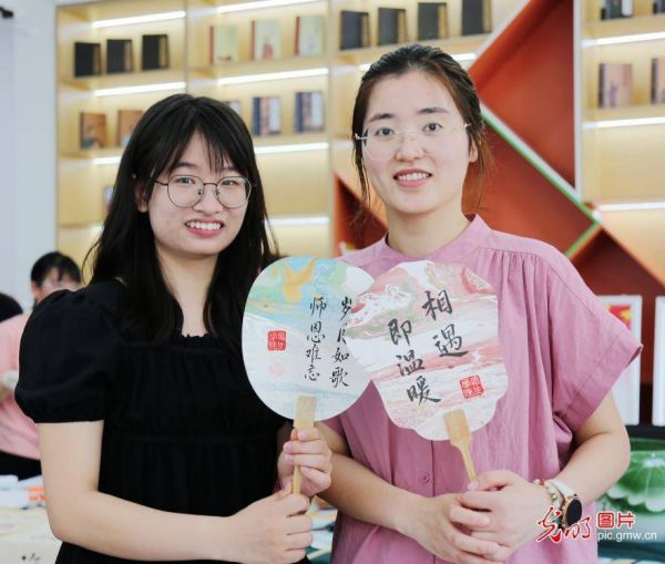 2024年6月14日,江苏南通科技职业学院,毕业生们为老师制作中国非遗文化漆扇,用毛笔将祝福寄托于扇面之上,以别样的方式表达感恩之情。(冯凯敏摄/光明图片)