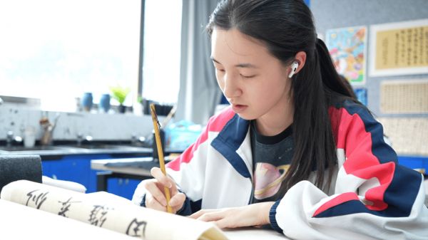 初二年级的朱瑞霖同学是一位书法爱好者,他的硬笔书法《将进酒》,每个字都写得清晰、工整,笔画之间流畅自然,展现了其深厚的书法功底。据悉,朱瑞霖是一位艺术多面手,经常出现在学校大型演出活动中,用自己的歌声传递青春与活力。高一学生刘思彤作品以山水为主题,展现了她对自然美景的细腻观察和对传统绘画技法的娴熟掌握,让人仿佛置身于山水之间。刘思彤学习书法已有十几年,国画也学习了五六年,曾多次参加国内外的文化交流活动。 “国画和书法对我来说不仅是技艺的锻炼,更是心灵的寄托。” 她告诉记者,即便在学业紧张的高中阶段,她依然坚持抽出时间学习书画,期待能在更大舞台上绽放光芒。