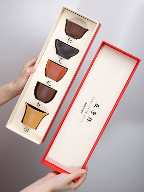 这五杯匠心独运将五色之泥,承于仁、义、礼、智、信,五杯承五德,用来作主人杯,所用之人随时间而变化,随心性而生长。