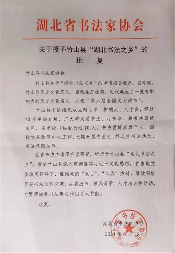 湖北省书法家协会下发的《关于授予竹山县‘书法家之乡’的批复》指出:竹山县历史文化悠久,自然生态优美,近代诞生了一批有影响力的历史文化名人,入选“第六届全国文明城市”。竹山县书协组织成立时间早、影响大、人才多,经过四十多年的发展,广大群众爱书法、习书法、藏书法蔚然成风,省市级书协会员近70人,书法爱好者近千人。围绕党委政府中心工作,长期开展专业性、群众性书法活动,书法氛围浓厚。
