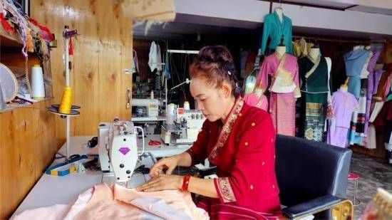 为了实现心中的梦想,18岁那年,玉段只身一人到景洪市学习傣装的缝制,学成归来,她在寨子里开了整董镇第一家傣装店,开始逐步实现她儿时的梦想。进货、裁剪、缝制、熨烫、销售......玉段一个人包揽了傣族服装的所有过程。为了提高效率,她利用晚上来绘制和剪裁面料,白天则进行衣服缝制和装饰,即使在睡前休息时她也会躺在床上思考服装的样式。