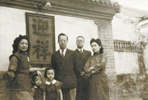 从左至右:姑姑、何大齐、姐姐、父亲、四叔、母亲在迎门的影壁前