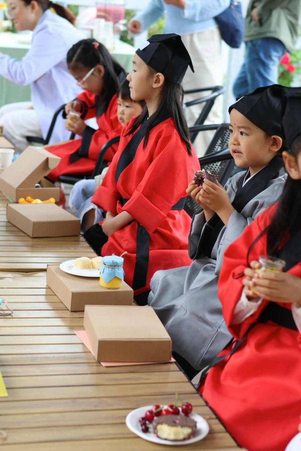 开智礼、拱手礼、叉手礼。。。。。。中国是文明古国、礼仪形式也多种多样,随着传统文化被高度认可,同学们对中国的礼仪形式也充满了无穷的兴趣。此次研学活动以“开智礼”开场,研学老师为同学们讲解了古代颇有仪式感的“开学典礼”,并为每位同学点朱砂,同时献上美好的祝福,以此开启了当天的礼仪课程。
