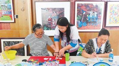 图为6月19日,在三江侗族自治县侗画馆,农民画作者在创作。