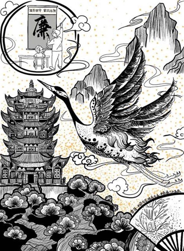 在漫画展开幕式现场,一等奖作品《江城家风》作者常倩,向记者分享了她的创作思路与感悟。《江城家风》不同于常见的漫画形式,颇有古画韵味:松柏掩映江边楼阁,仙鹤掠过缕缕祥云,江上明月映射出“清芬世守 家风永传”的图景,用笔白描而意蕴丰富。常倩说,希望以黄鹤楼诉说武汉城市历史,以仙鹤这一从古至今的美好意象作为廉洁的象征,以明月中父亲教导孩子学习写“廉”字的画面,传达“清廉家风润江城”的主题。常倩表示,家庭是社会的基石,家风正则社会安,希望通过自己的作品引起更多人对清廉家风的关切和重视。