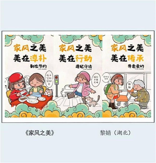 二等奖作品《家风之美》的创作者黎婧,则选择了三栏绘画的形式传递清廉家风,她以生动鲜活的笔触、萌趣可爱的画风绘制了“勤俭节约”“遵纪守法”“尊老爱幼”等美好家风。黎婧表示,“勤俭、守法、尊老爱幼”正是自己从小所受到的家风教育,希望以自身经历的漫画表达传递清廉家风之美,促进美好家风的传承与行动。
