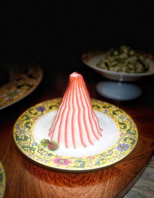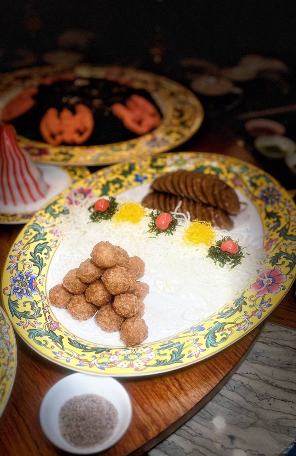 这是一道刀工与美味并重的菜,旁边雕刻的南瓜蝙蝠也是亮点,合起来有“万福”的美好寓意。