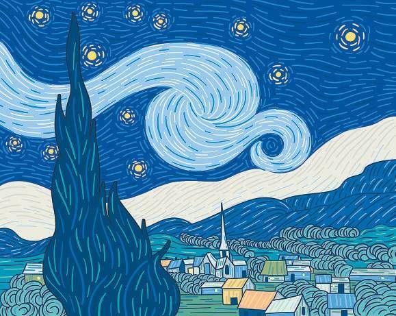 梵·高,一个知名的画家。第一次见到他的《星月夜》时我还没有上学。我被他笔下扭曲的夜空吸引了——深深浅浅的各种蓝色不断拐弯、旋转,并带动月亮黄色的光芒一起旋转;最显眼的那棵大树与旁边的村落很不成比例,它们仿佛都在摇曳、扭动。这幅画高超的绘画技巧和怪诞的艺术风格深深打动了年幼的我,也让我记住了梵·高这个名字。
